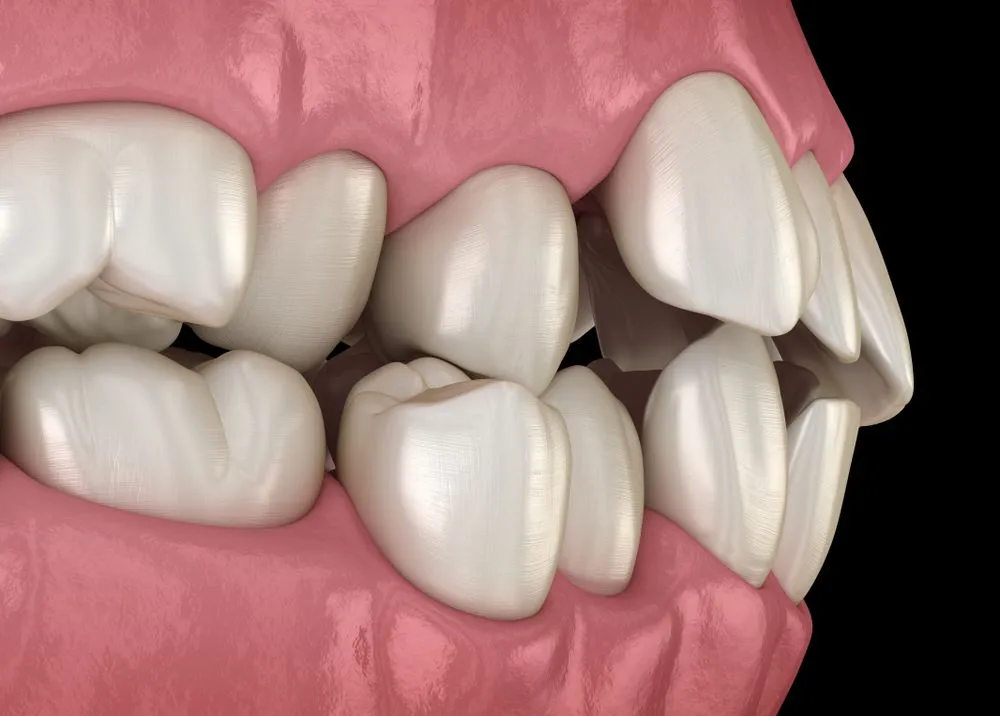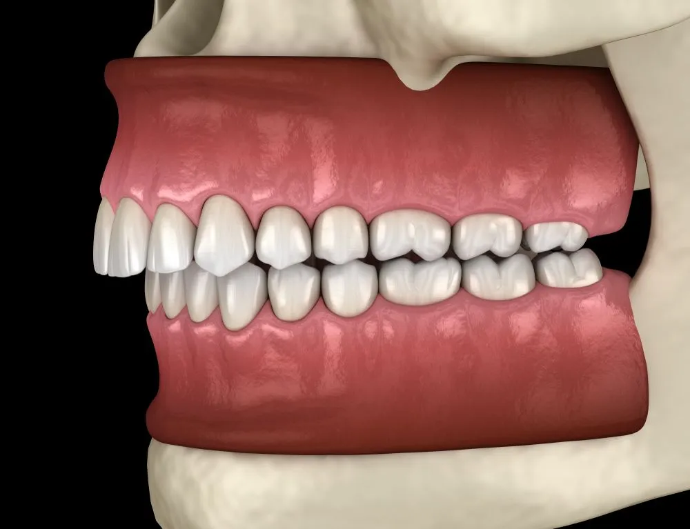 An underbite is when the lower front teeth protrude beyond the upper front teeth, causing the chin to appear more prominent. Though less common than overbites, underbites can cause similar problems with chewing, speaking, and jaw discomfort. Proper treatment can help correct the alignment and prevent future dental complications.